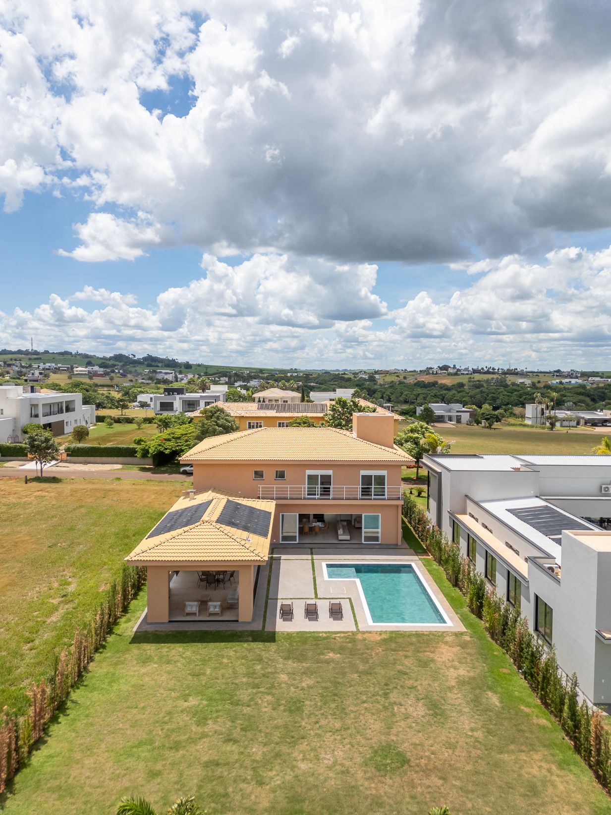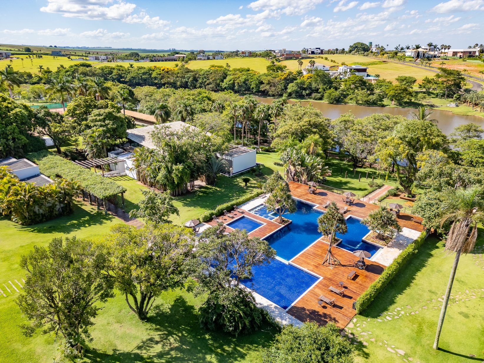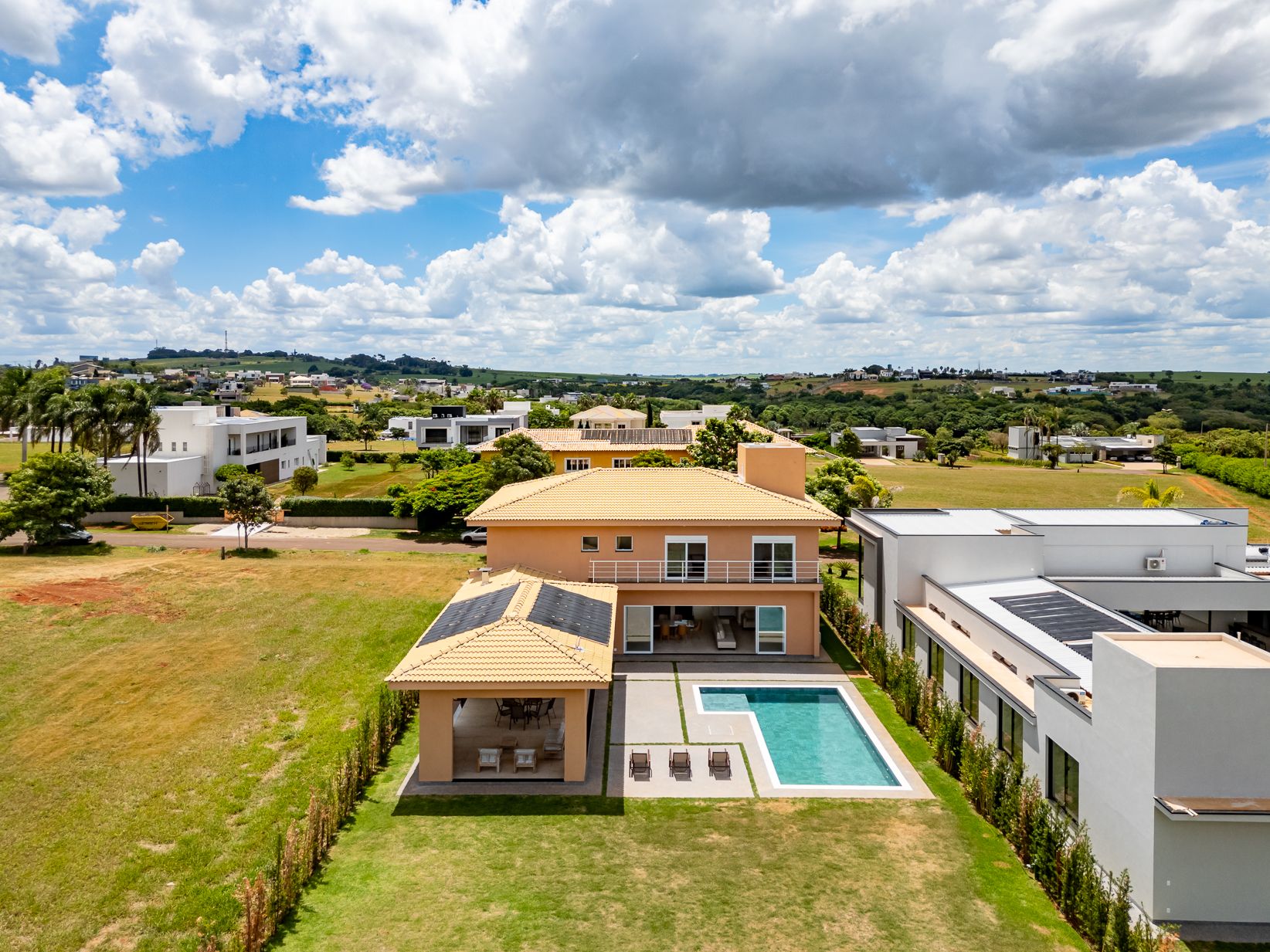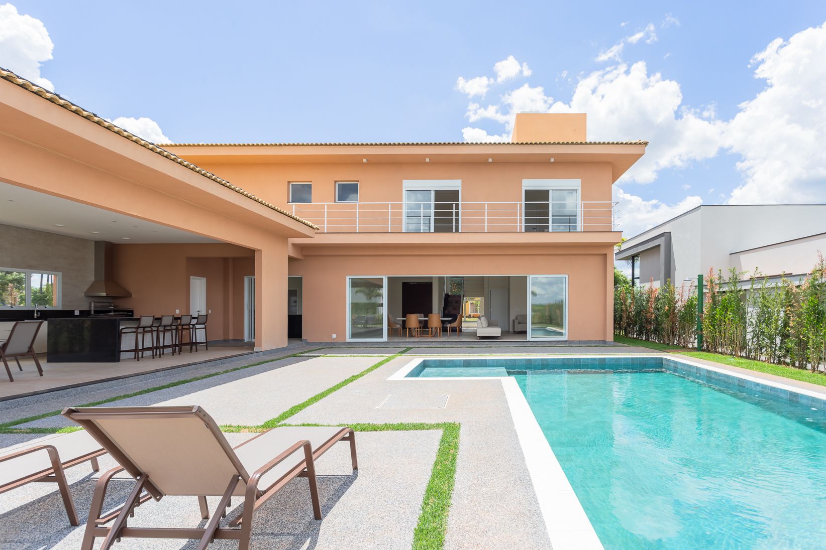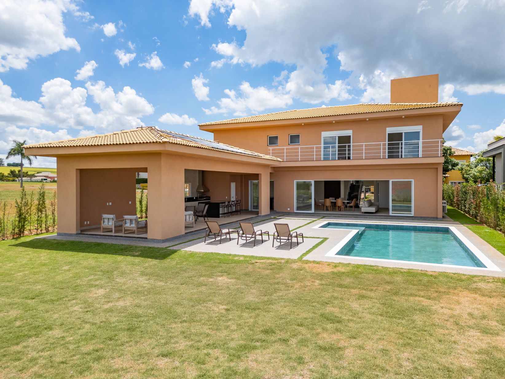 No Residencial Fazenda Alvorada (Porto Feliz/SP), esta casa em lote de 1.000 m² oferece 448,85 m² com planta integrada e 5 suítes climatizadas — a máster com closet e terraço. O living conecta estar + jantar + cozinha em conceito aberto, privilegiando convivência e luz natural. Para receber, a área externa traz espaço gourmet completo com churrasqueira e piscina aquecida, garantindo uso em qualquer estação. Há ainda escritório, facilmente reversível para 6ª suíte, conforme a necessidade da família. Venda: R$ 5.500.000. O condomínio reúne um clube de campo completo, com lagos, quadras (tênis, beach tênis, squash e poliesportiva), salão de festas, spa/sauna, market, restaurante, além de portaria e vigilância 24h — qualidade de vida a ~1h de São Paulo. (Valores de condomínio/IPTU não informados no anúncio.)