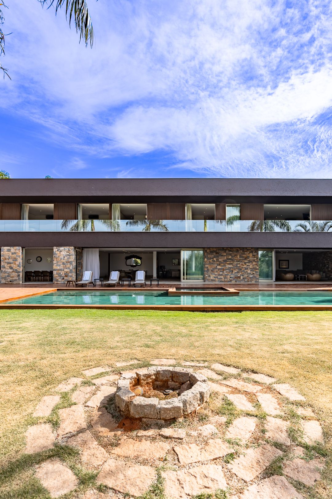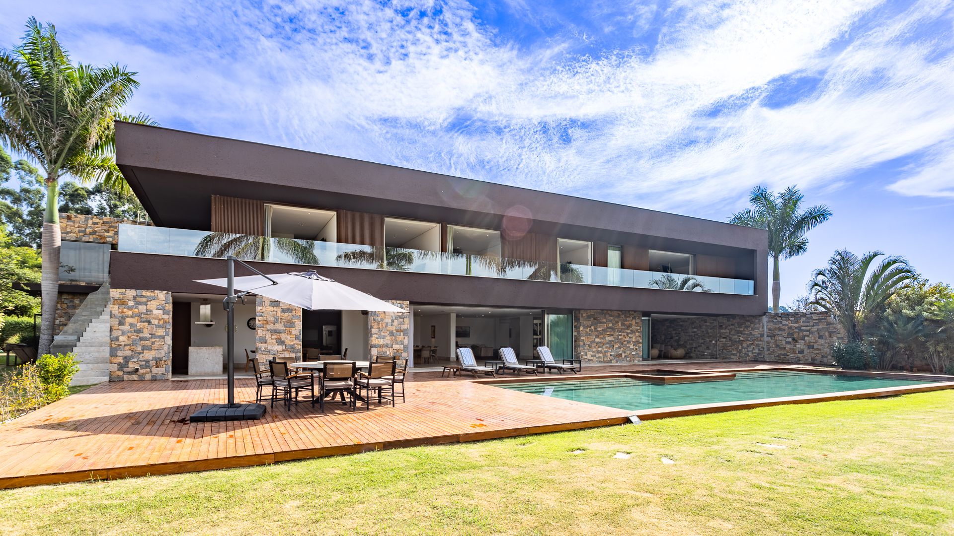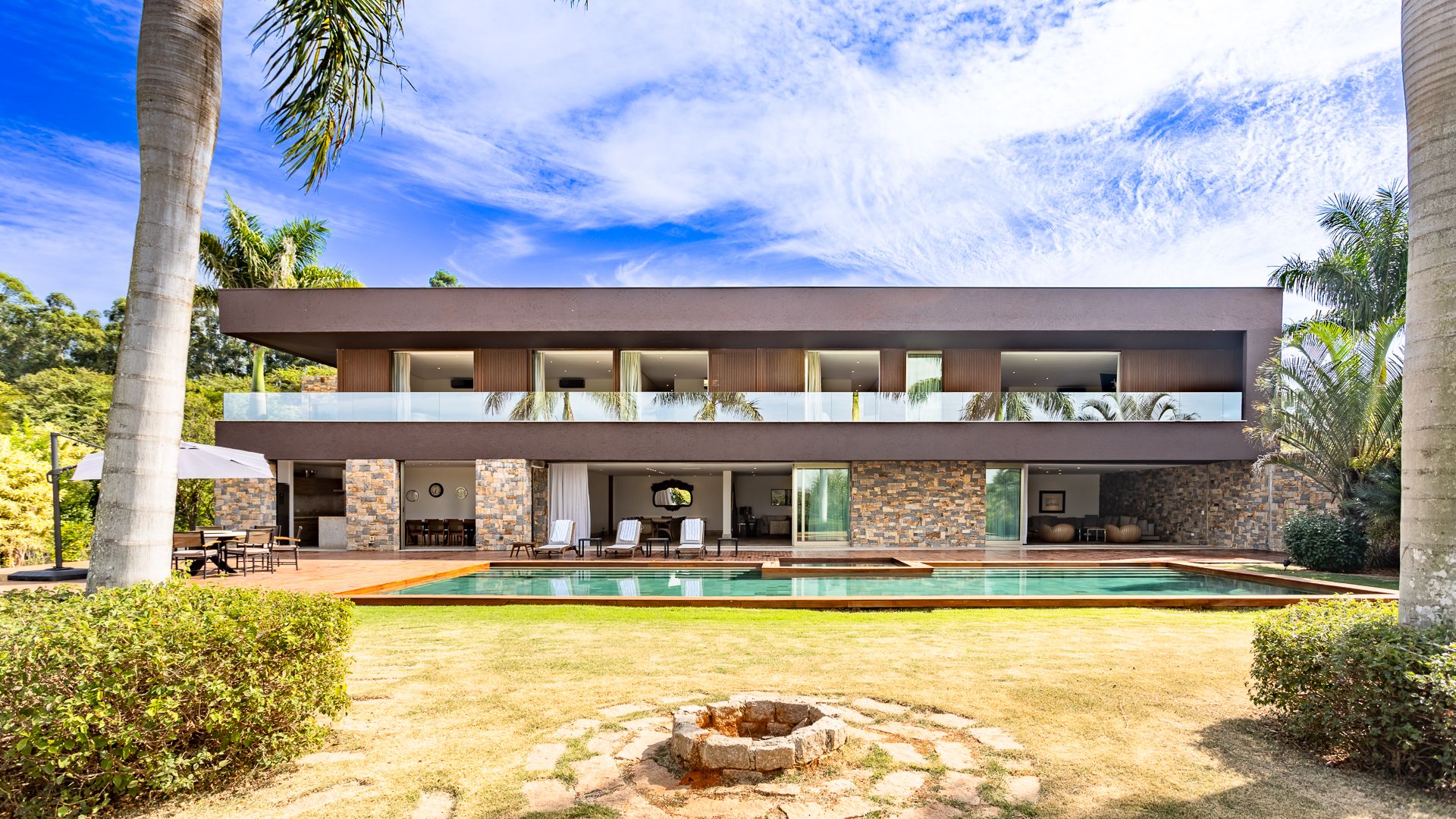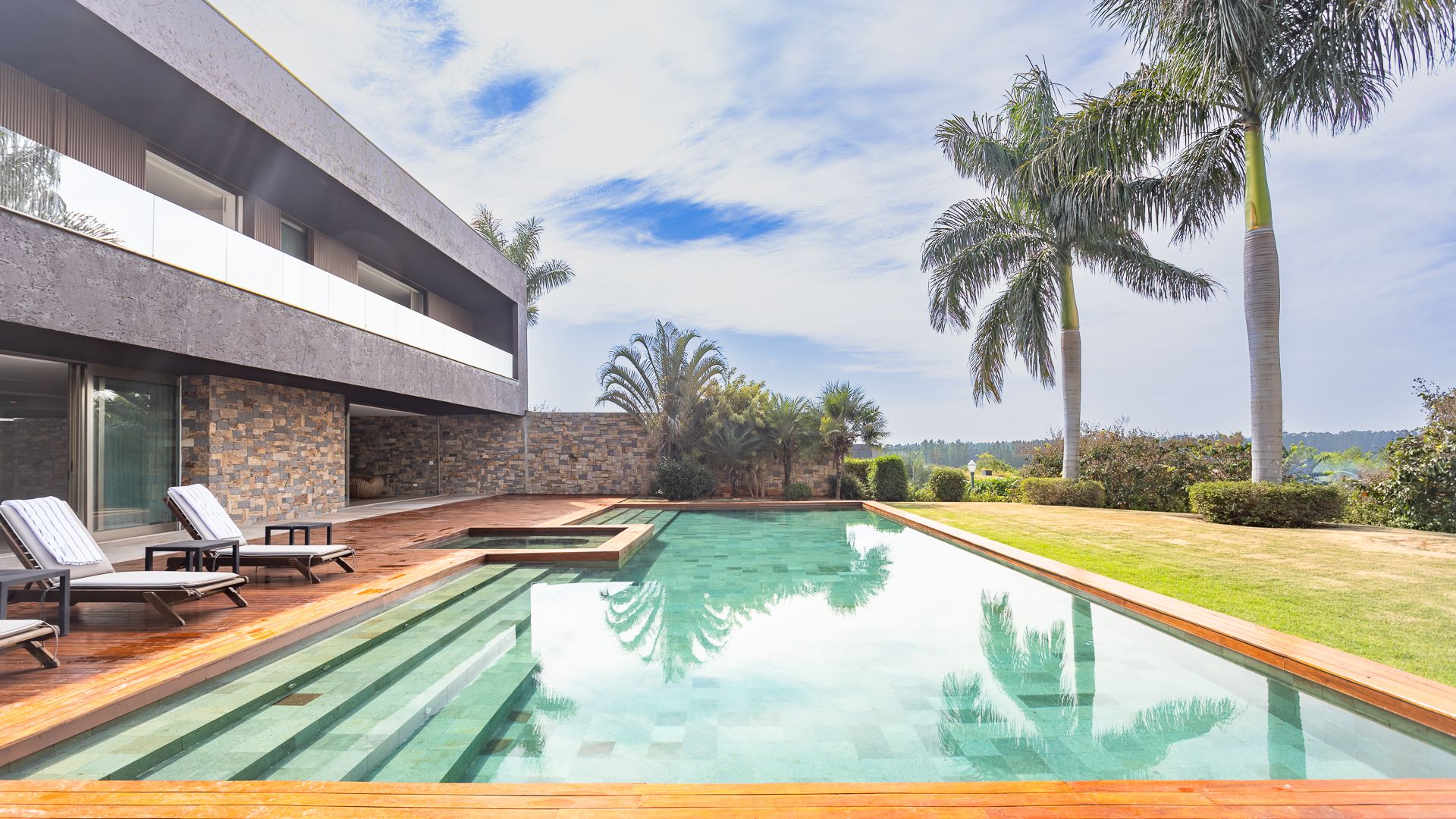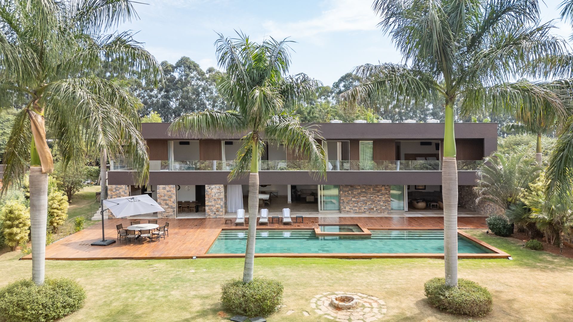 Em um terreno de 2.569 m², esta casa mobiliada na Fazenda Boa Vista entrega 1.900 m² com um projeto de linhas contemporâneas e fachada em aço Corten. O eixo social é generoso: living para 5 ambientes e 6 varandas, criando percursos fluidos entre interior e exterior. A ala íntima reúne 5 suítes, sendo a máster com walk-in closet e banheiros Sr. e Sra.; todos os ambientes são climatizados e recebem acabamentos em madeira e pedra. No lazer, um spa completo com sauna seca e úmida complementa a área externa. Garagem para 10 carros. Venda: R$ 35.000.000. No condomínio, a menos de 1 hora de São Paulo, o morador encontra golfe, polo, tênis e beach tênis, além de piscina, academia, kids club e fazendinha — infraestrutura com heliponto, parque dos esportes, market/lojas, restaurantes, spa, sala fitness e segurança 24h.