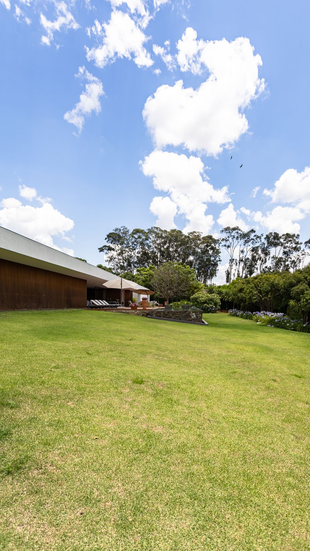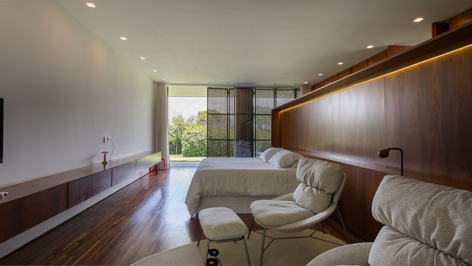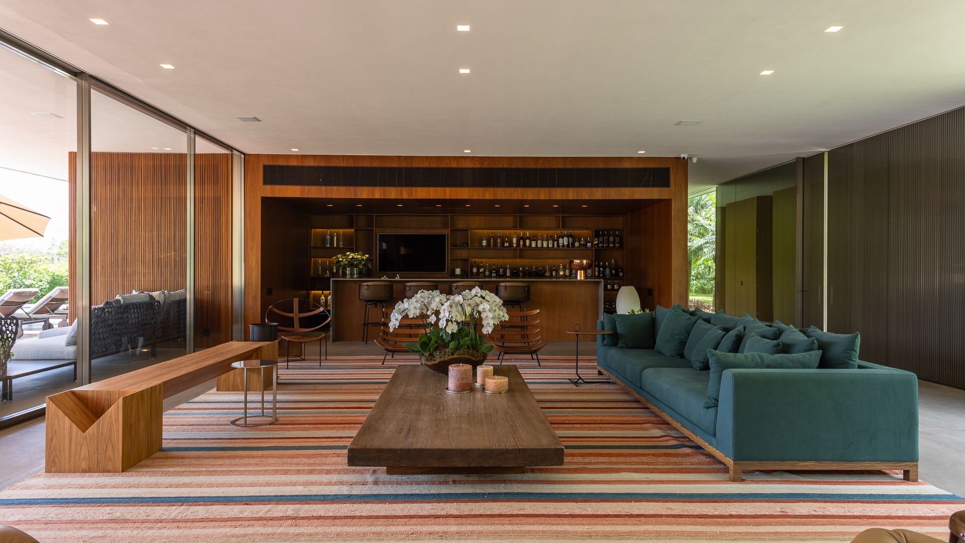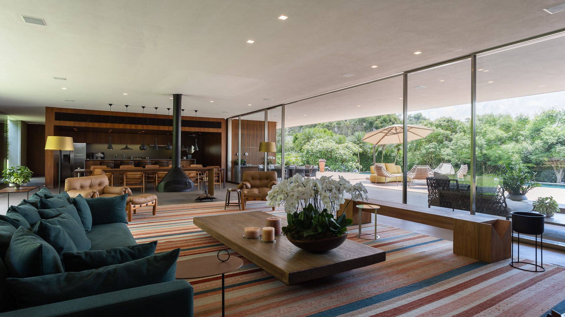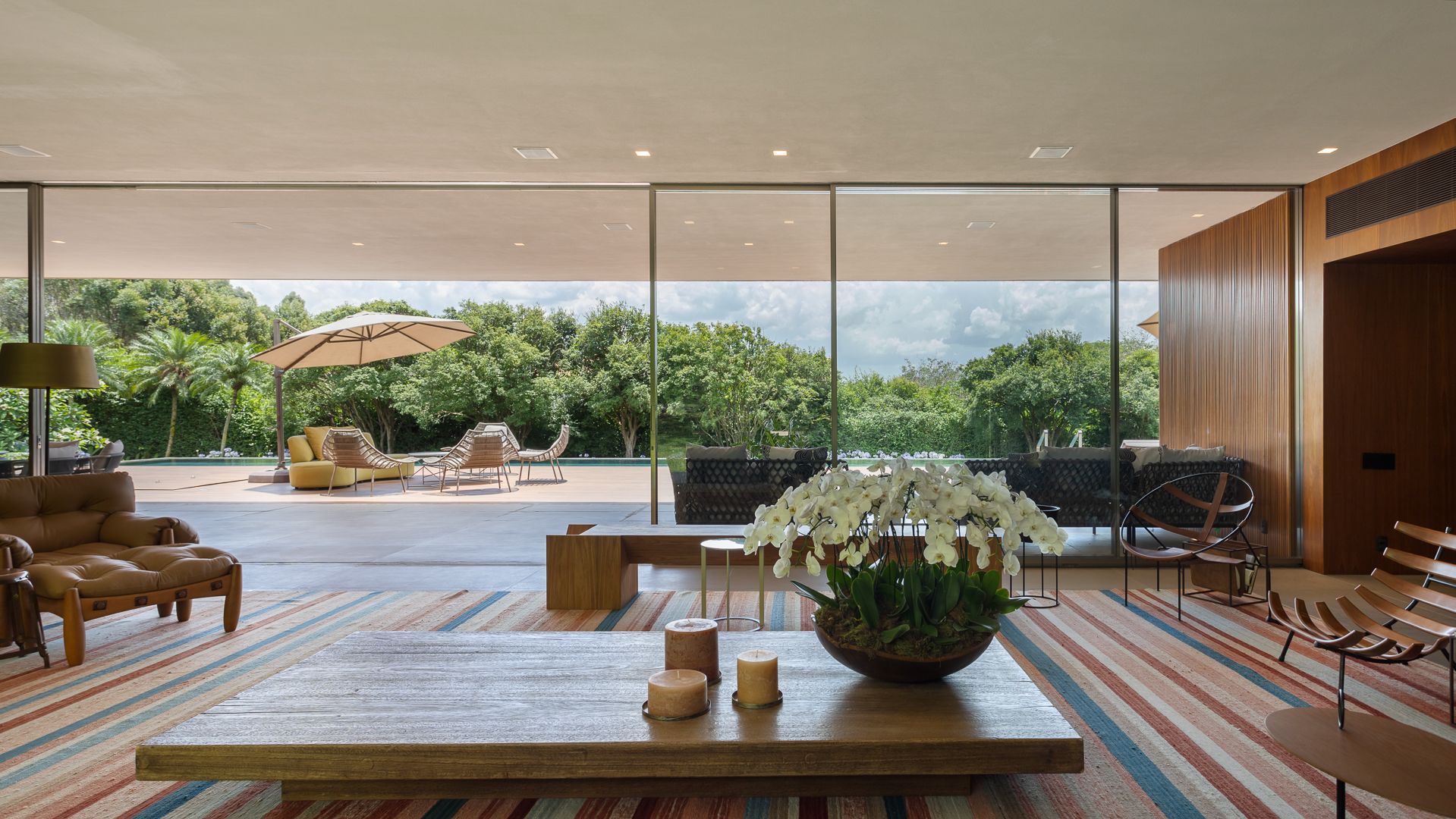 Assinada pelo arquiteto Marcio Kogan, esta residência na Fazenda Boa Vista tem fachada horizontal e programa 100% térreo em lote de 3.950 m². Os ambientes foram pensados em conceito aberto: o living com janelas piso-teto se prolonga ao deck e à piscina, formando um único eixo de convivência; cozinha e bar integram o social para receber com praticidade. A ala íntima traz 4 suítes com acesso também pelo exterior. No final do corredor, um spa com sala de ginástica e sauna completa o lazer privado. Área construída/privativa: 1.010 m² • 4 vagas. Venda: R$ 39.900.000.