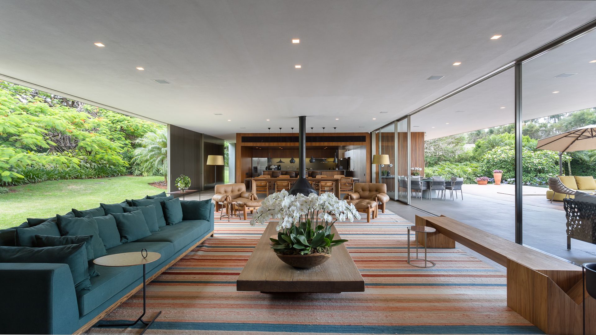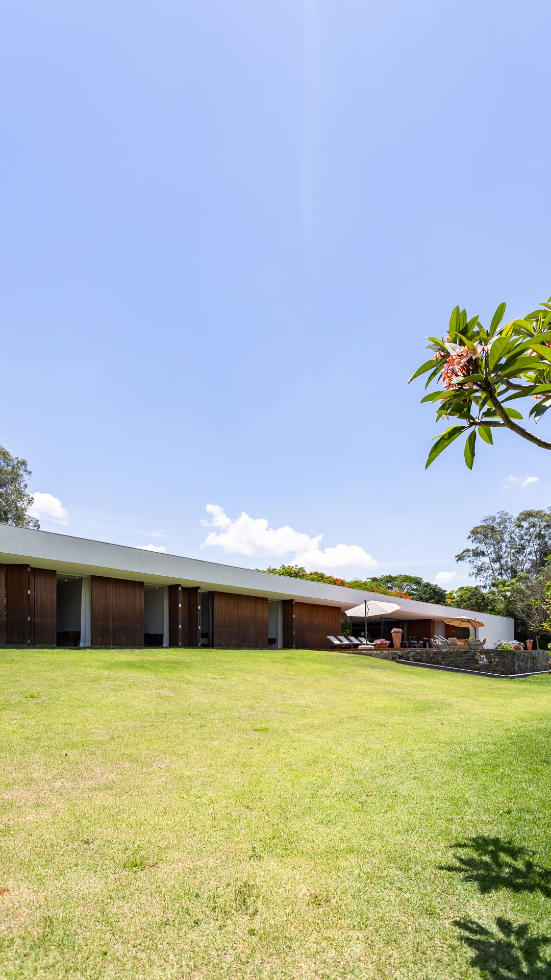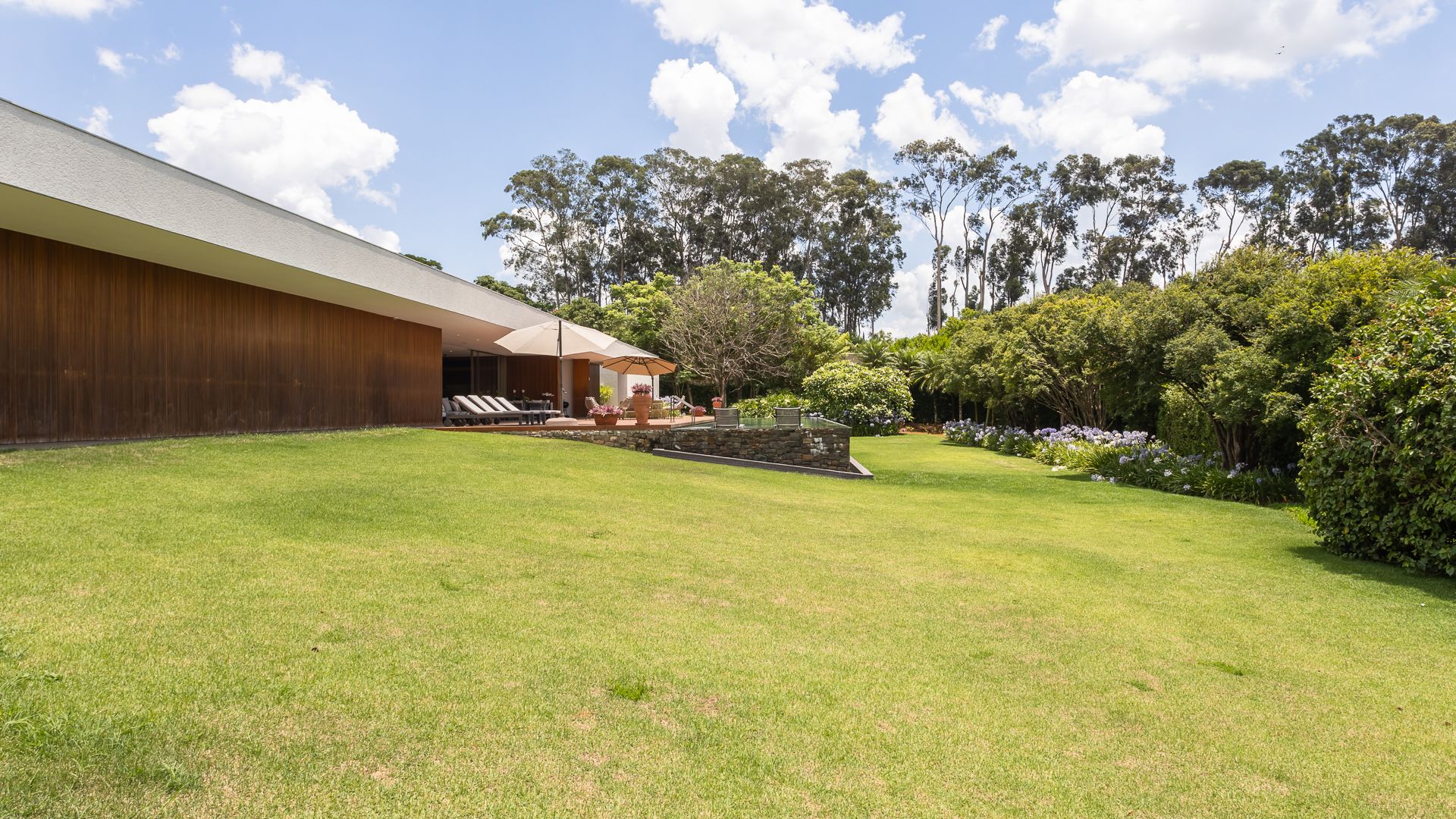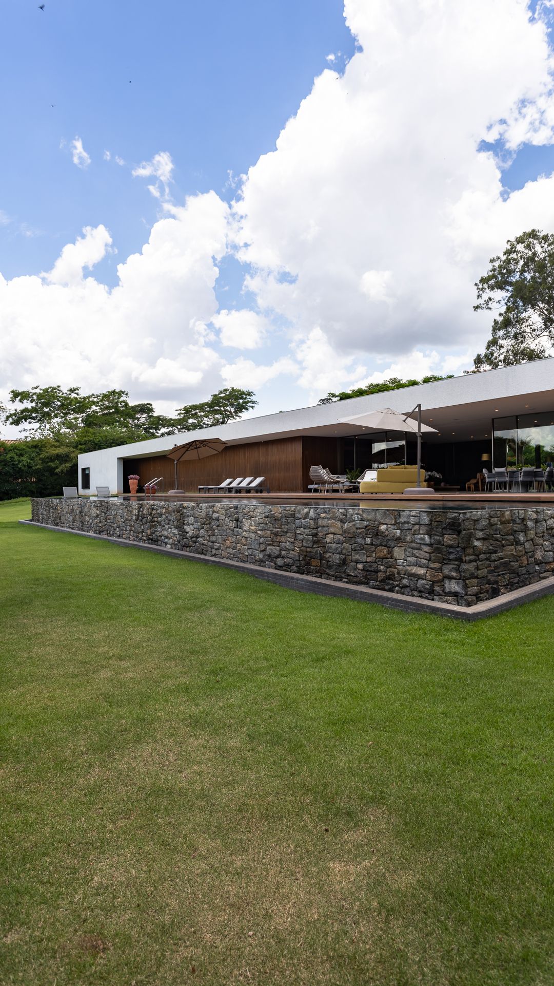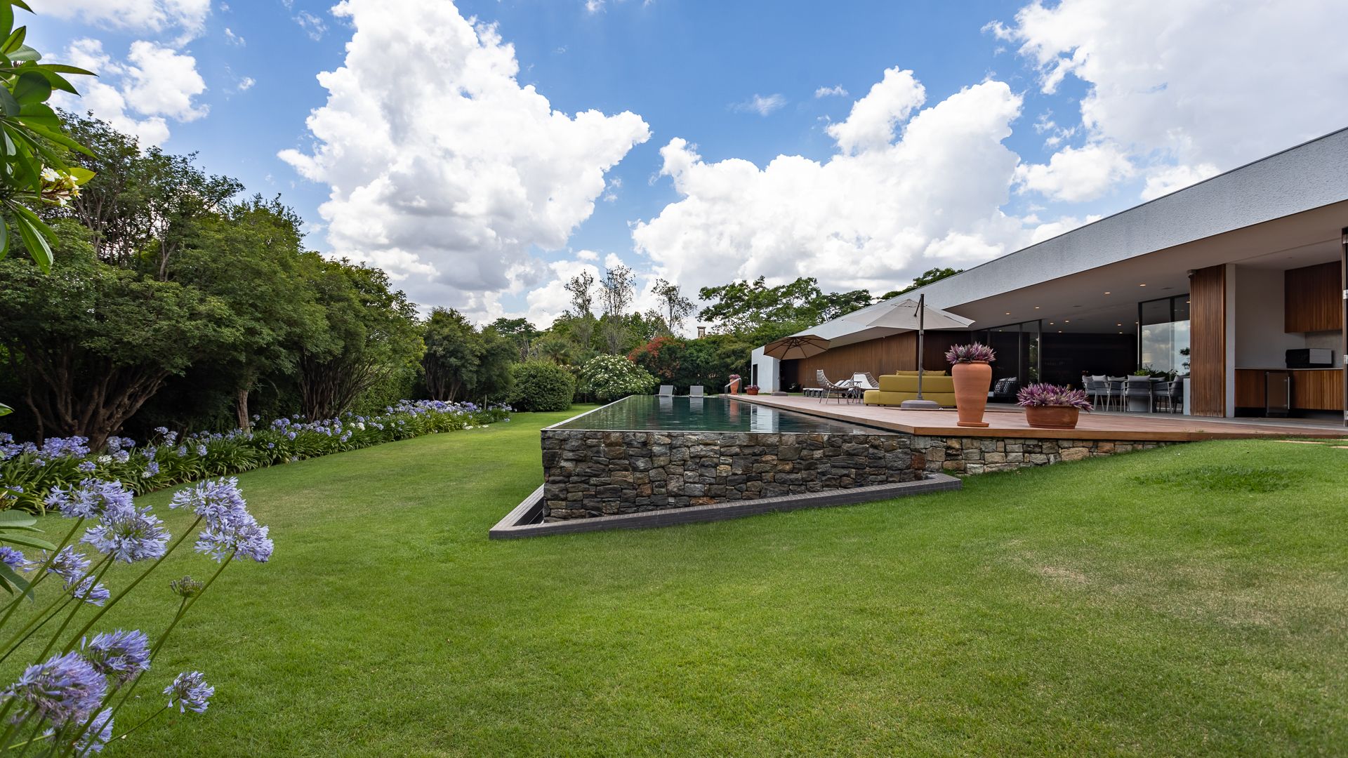 Assinada pelo arquiteto Marcio Kogan, esta residência na Fazenda Boa Vista tem fachada horizontal e programa 100% térreo em lote de 3.950 m². Os ambientes foram pensados em conceito aberto: o living com janelas piso-teto se prolonga ao deck e à piscina, formando um único eixo de convivência; cozinha e bar integram o social para receber com praticidade. A ala íntima traz 4 suítes com acesso também pelo exterior. No final do corredor, um spa com sala de ginástica e sauna completa o lazer privado. Área construída/privativa: 1.010 m² • 4 vagas. Venda: R$ 39.900.000.