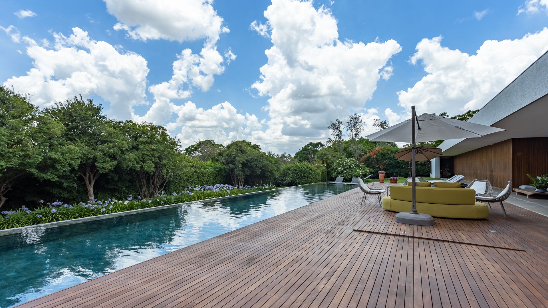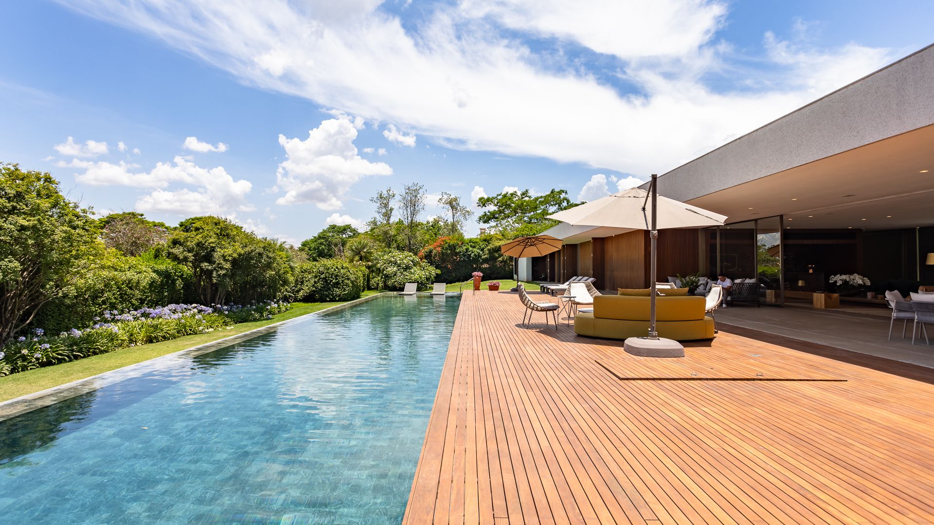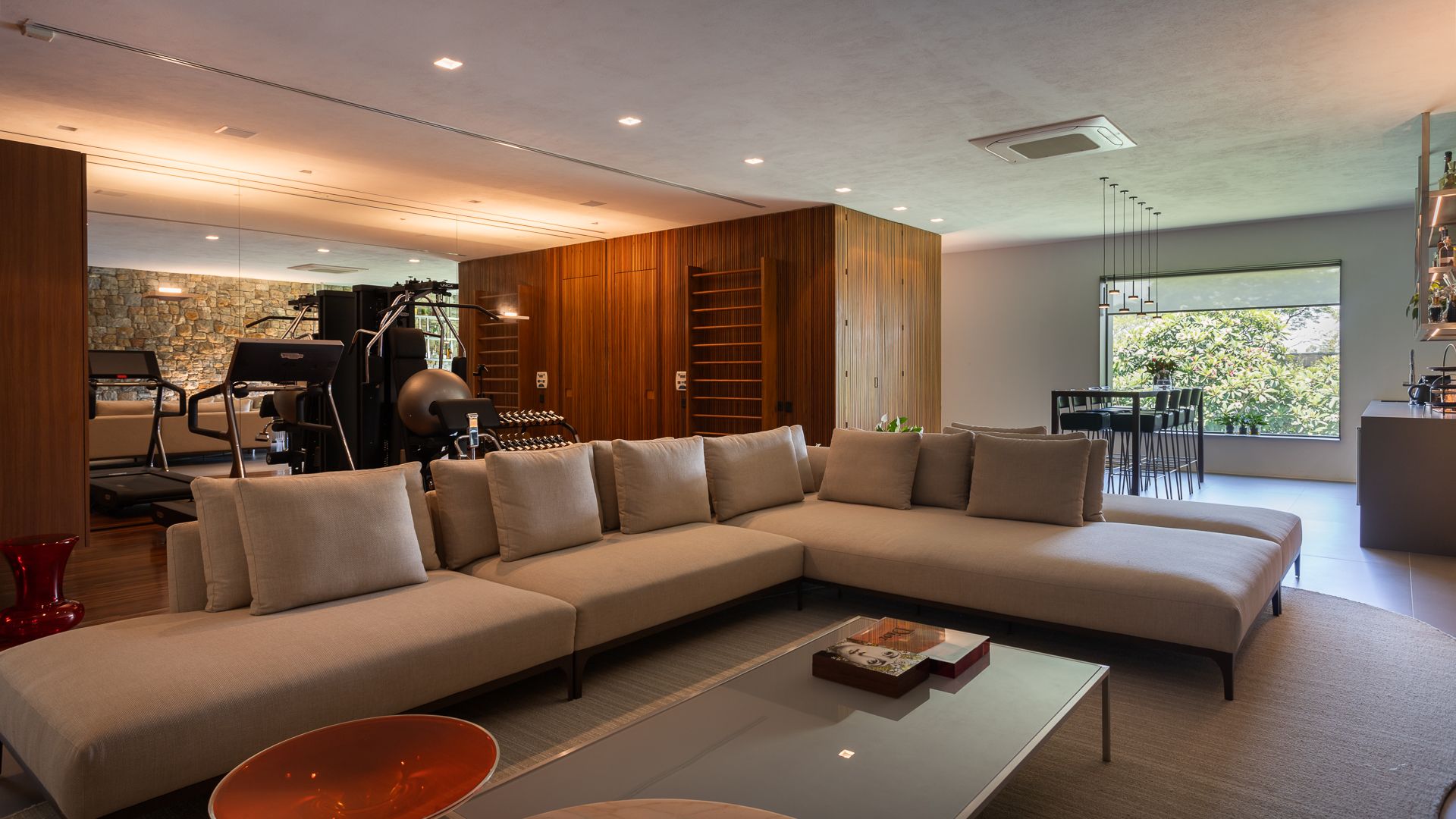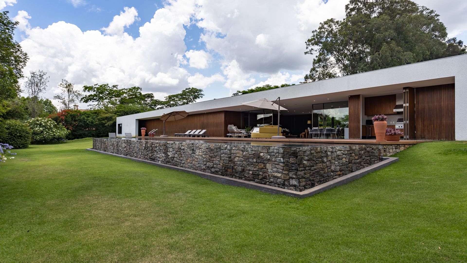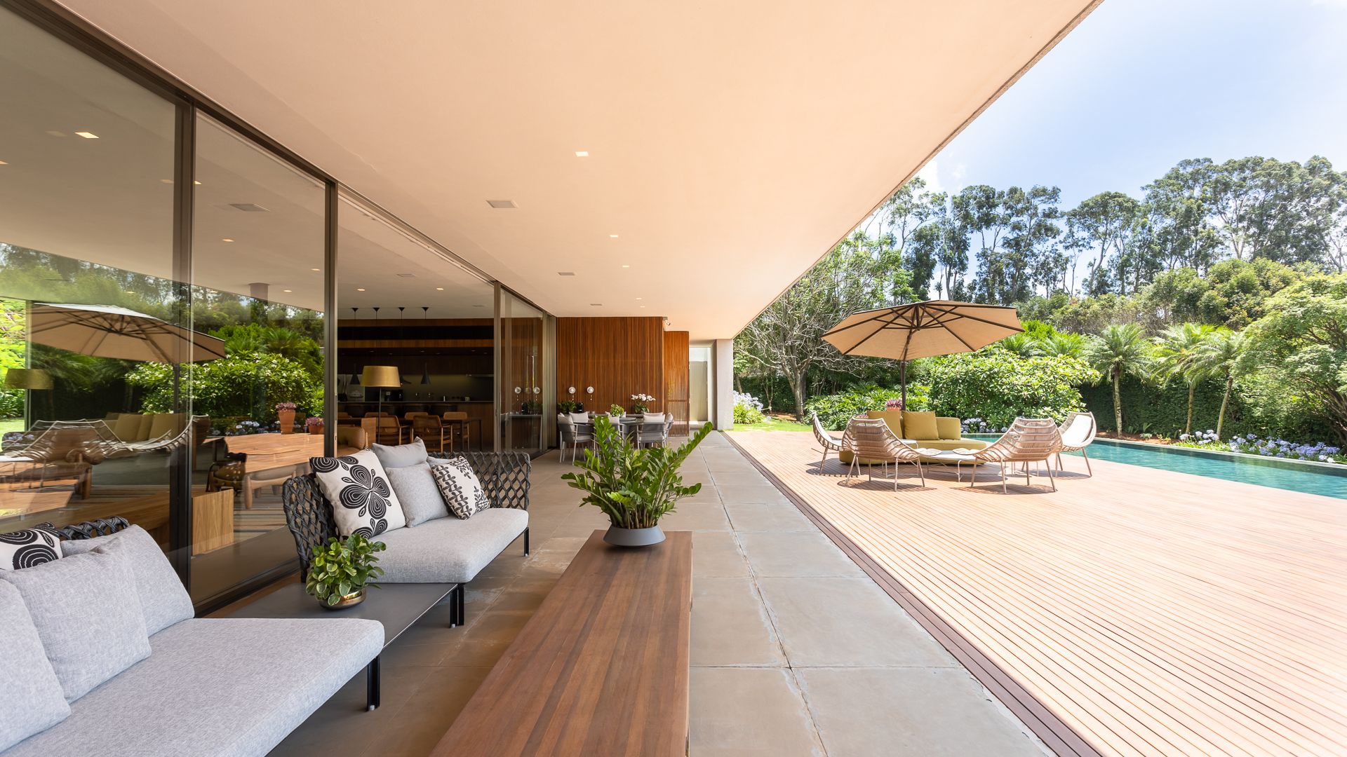 Assinada pelo arquiteto Marcio Kogan, esta residência na Fazenda Boa Vista tem fachada horizontal e programa 100% térreo em lote de 3.950 m². Os ambientes foram pensados em conceito aberto: o living com janelas piso-teto se prolonga ao deck e à piscina, formando um único eixo de convivência; cozinha e bar integram o social para receber com praticidade. A ala íntima traz 4 suítes com acesso também pelo exterior. No final do corredor, um spa com sala de ginástica e sauna completa o lazer privado. Área construída/privativa: 1.010 m² • 4 vagas. Venda: R$ 39.900.000.
