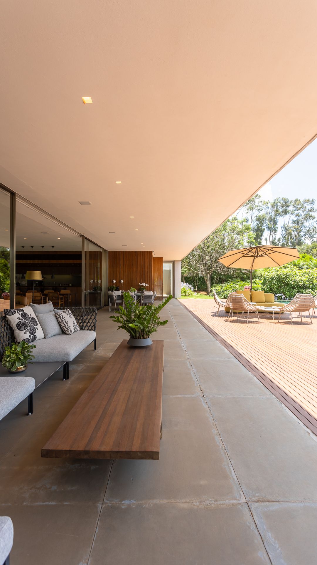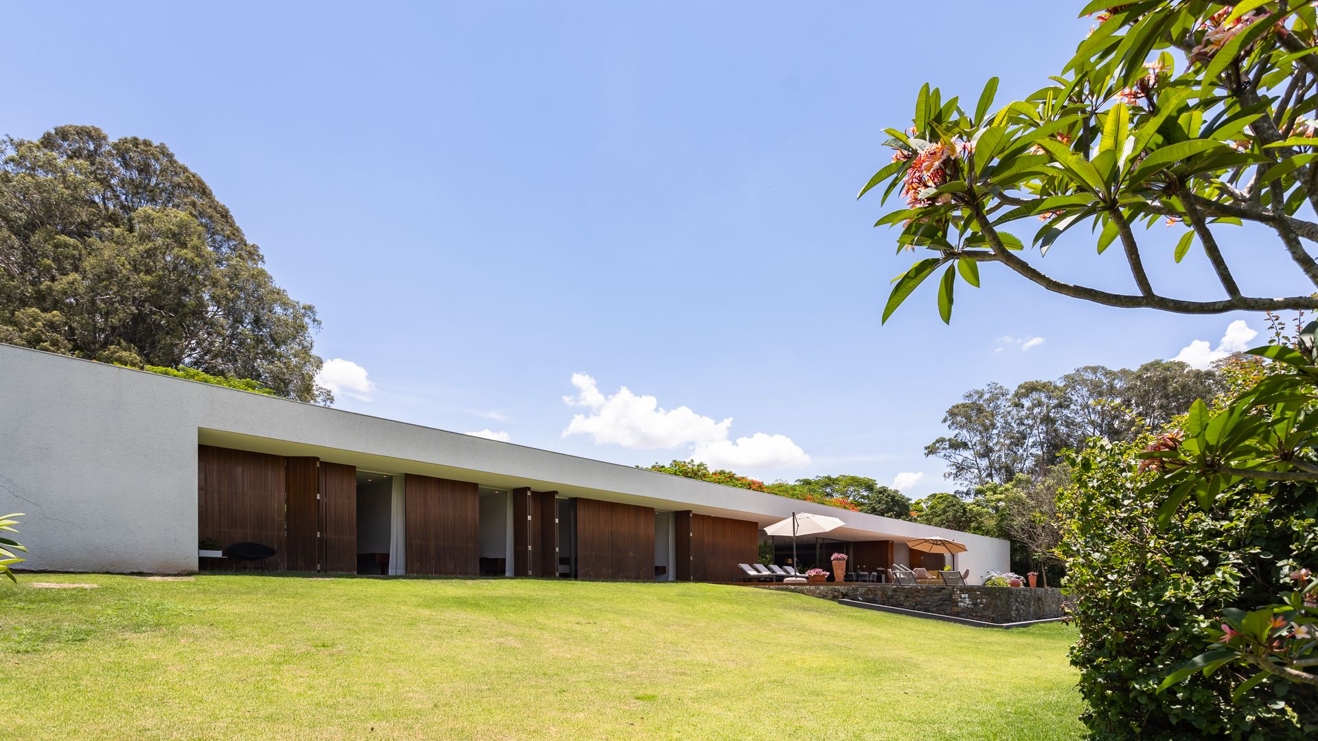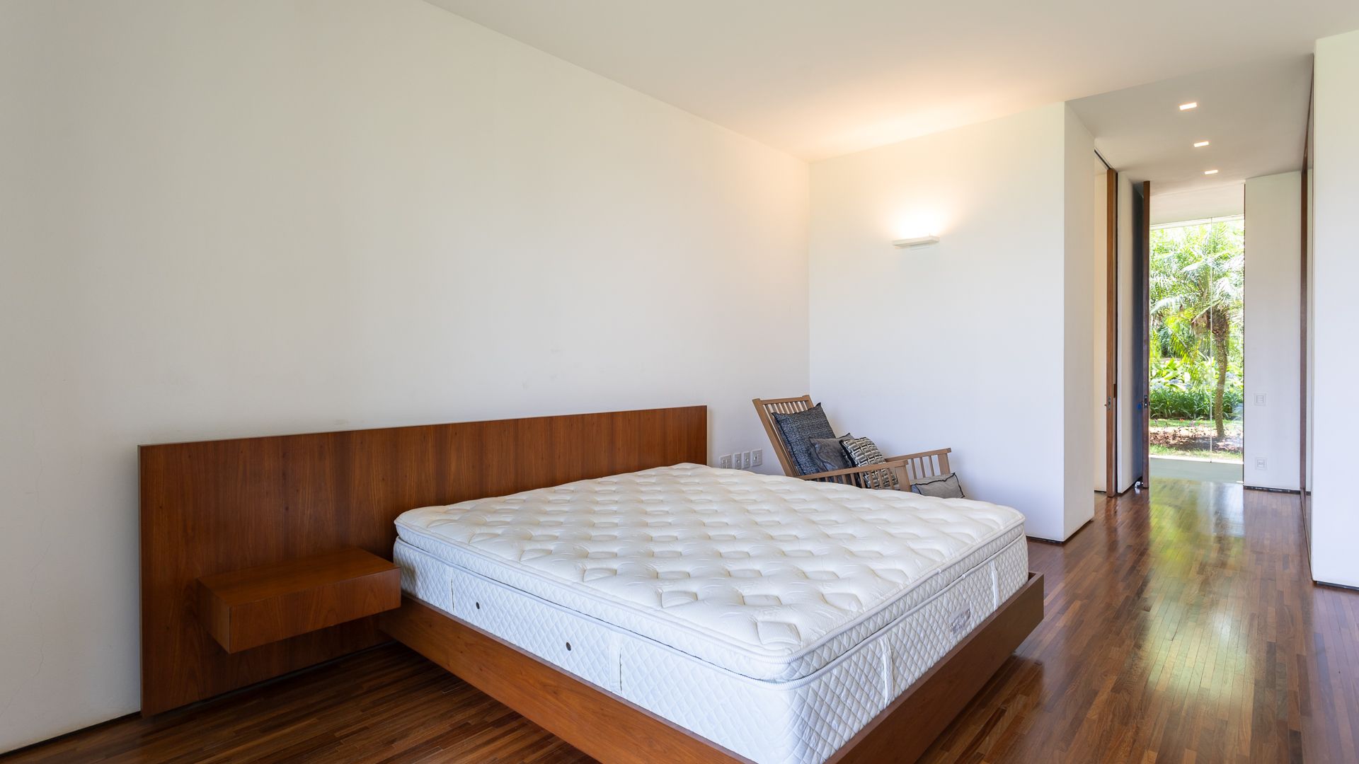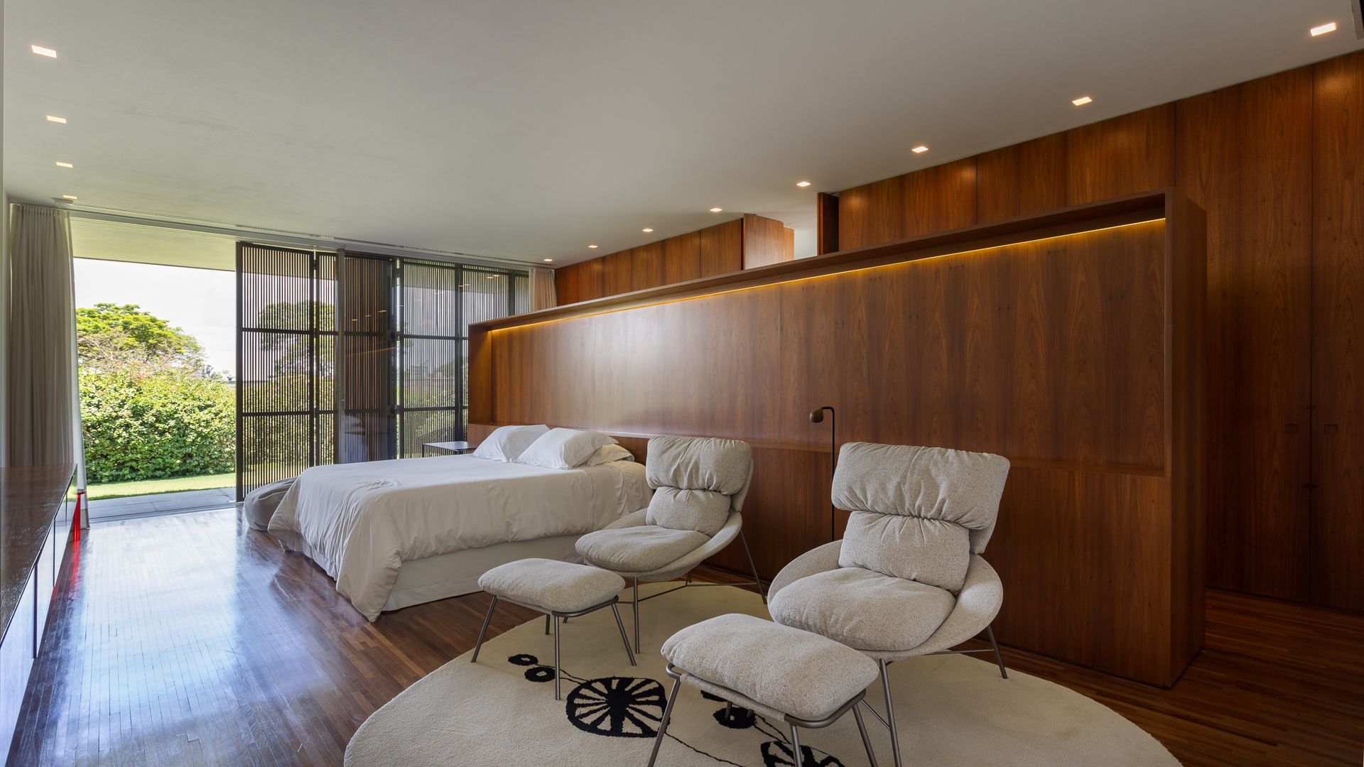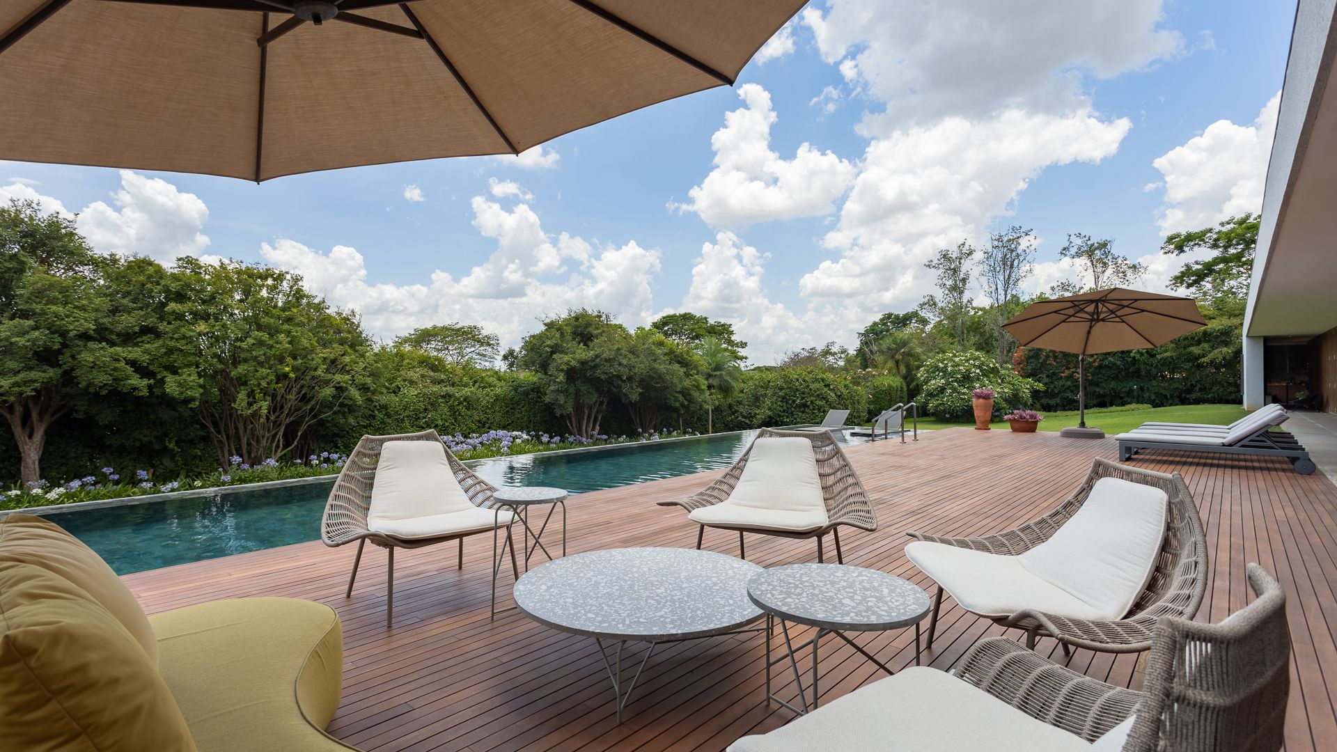 Assinada pelo arquiteto Marcio Kogan, esta residência na Fazenda Boa Vista tem fachada horizontal e programa 100% térreo em lote de 3.950 m². Os ambientes foram pensados em conceito aberto: o living com janelas piso-teto se prolonga ao deck e à piscina, formando um único eixo de convivência; cozinha e bar integram o social para receber com praticidade. A ala íntima traz 4 suítes com acesso também pelo exterior. No final do corredor, um spa com sala de ginástica e sauna completa o lazer privado. Área construída/privativa: 1.010 m² • 4 vagas. Venda: R$ 39.900.000.