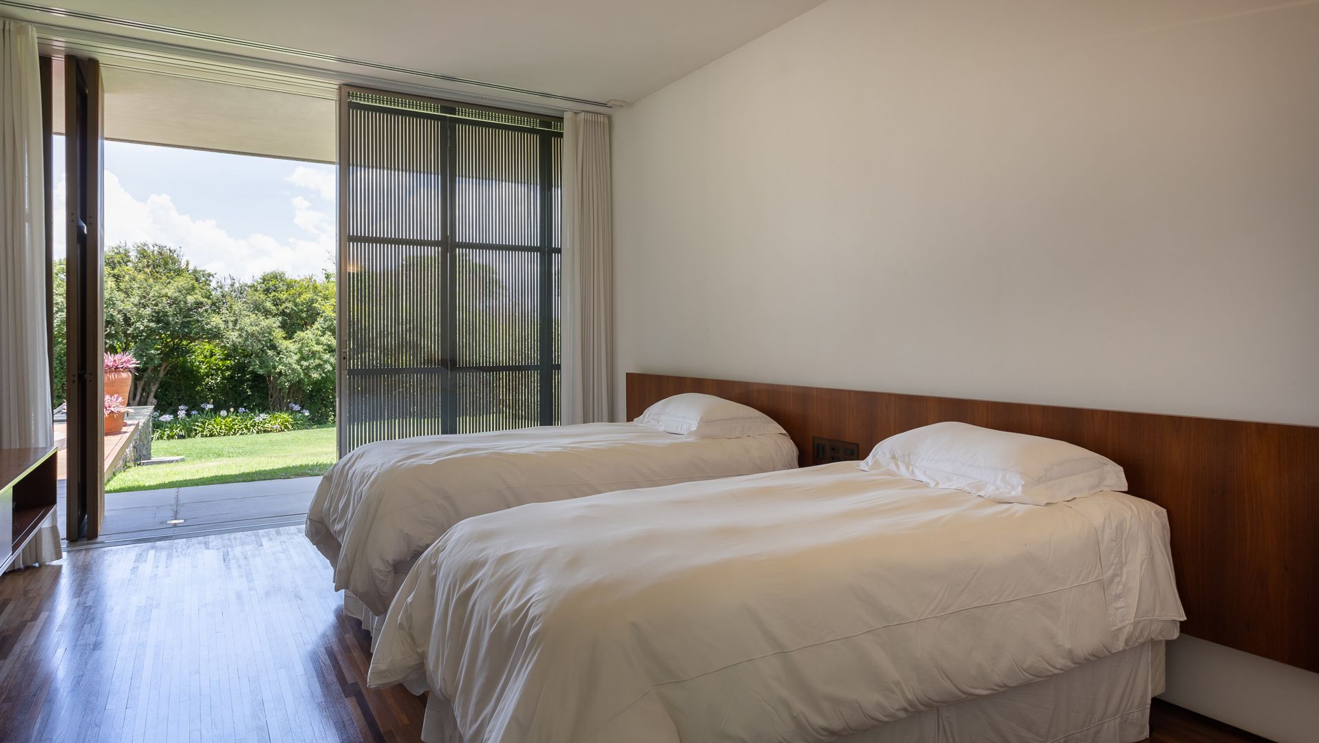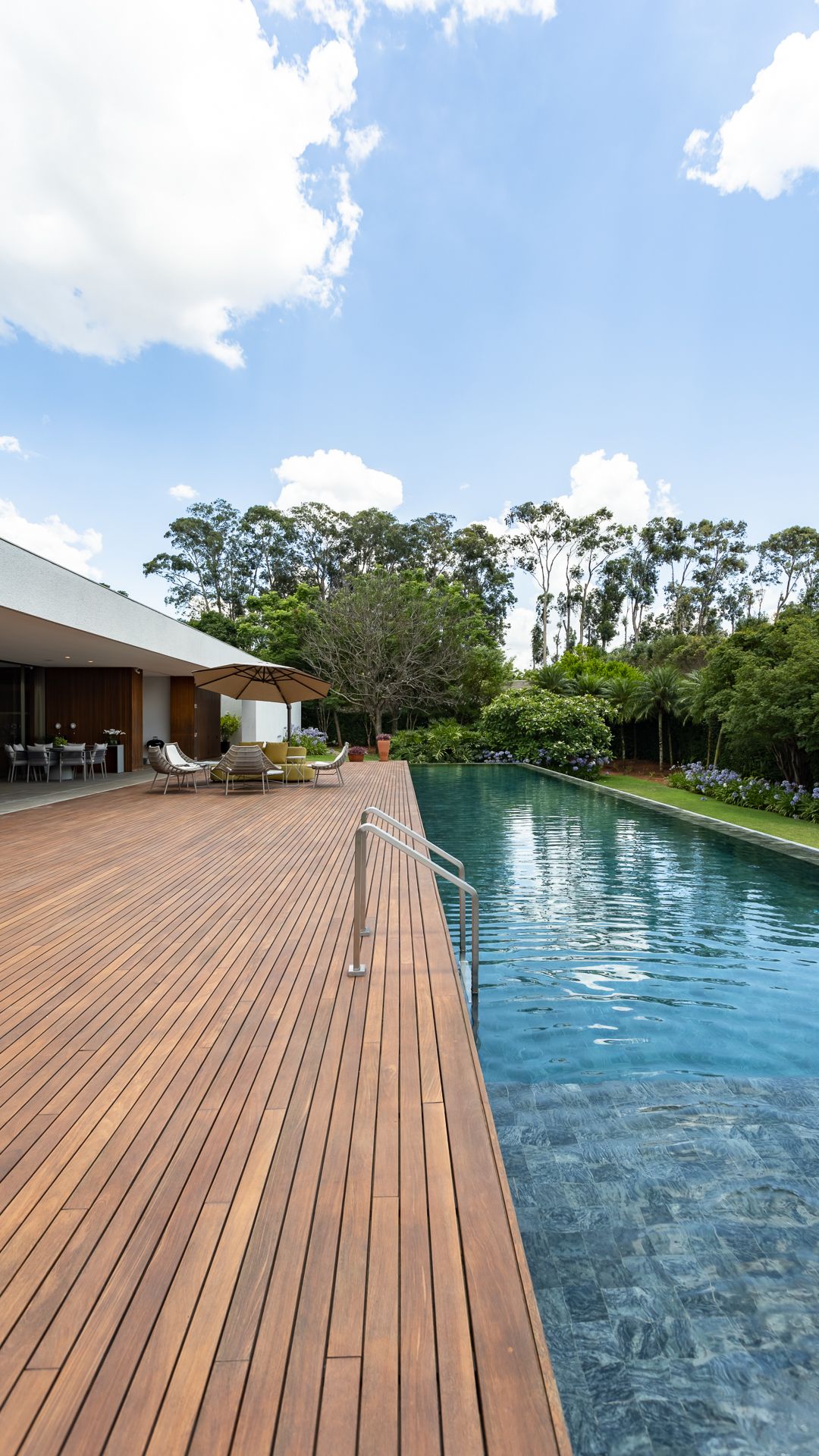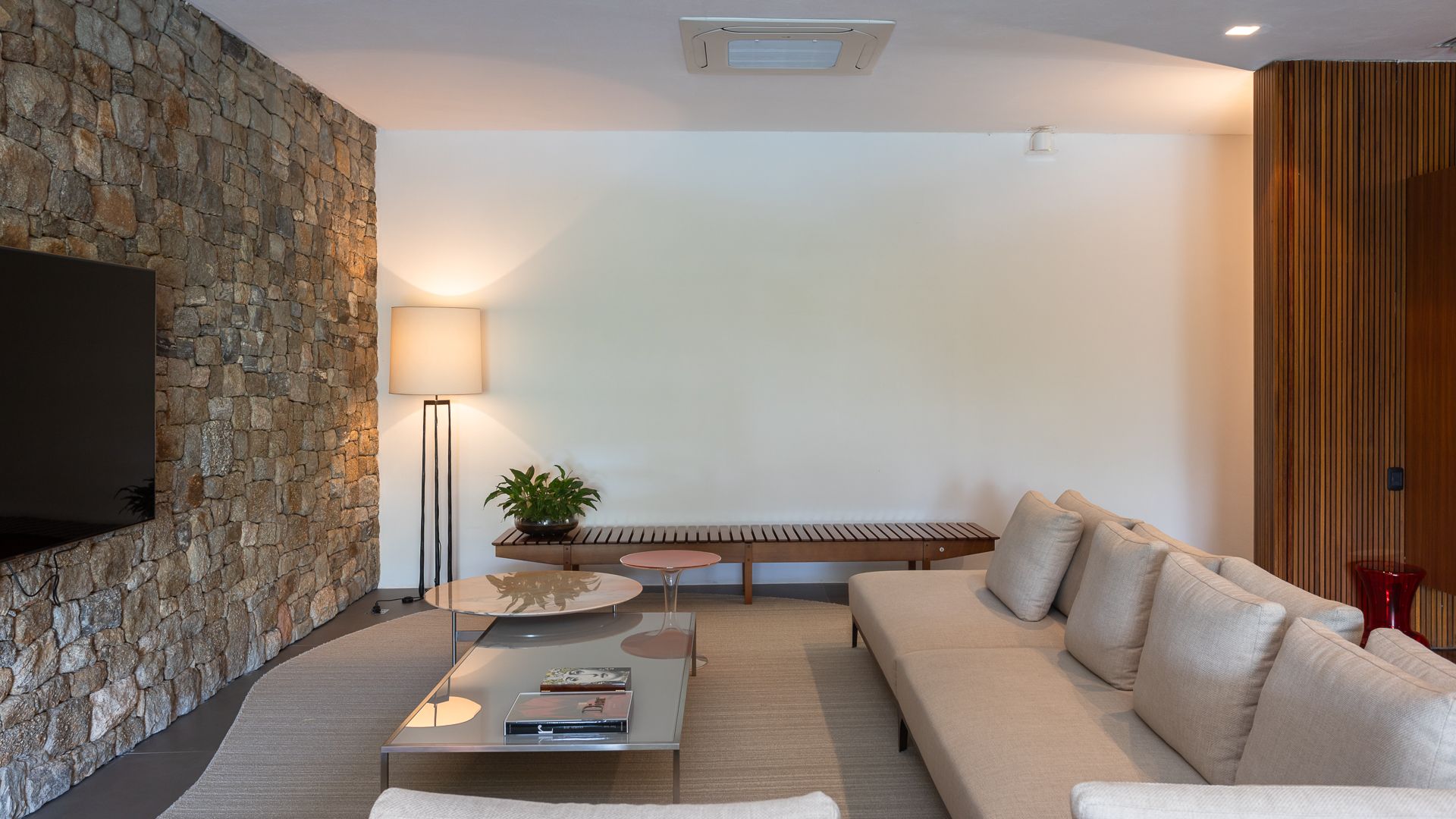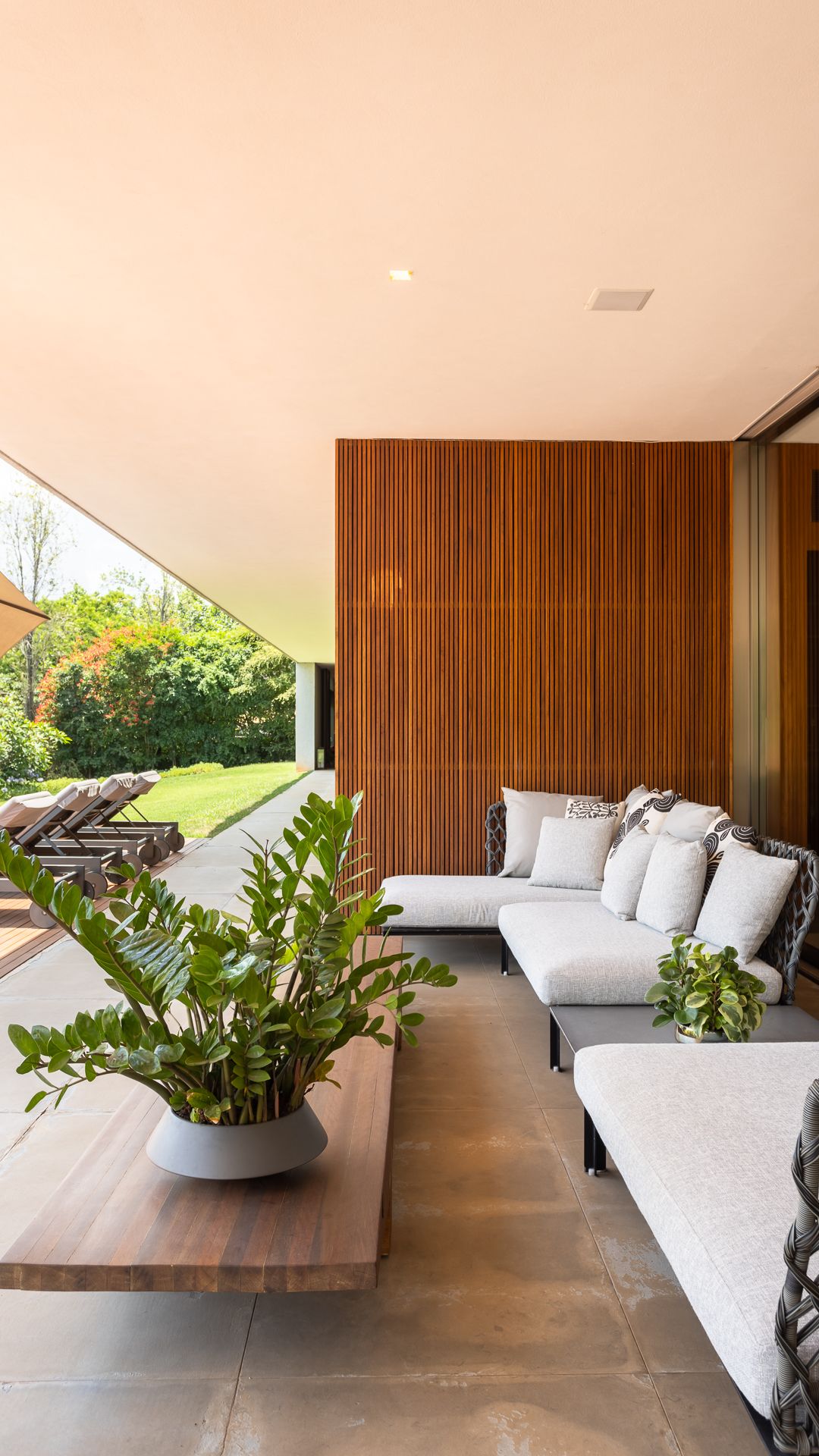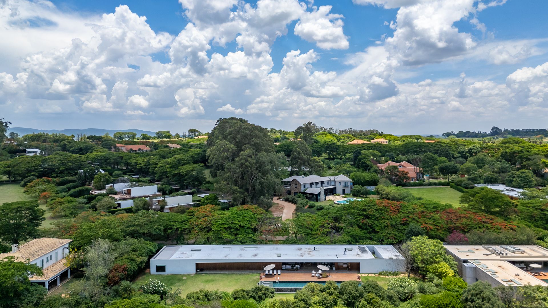 Assinada pelo arquiteto Marcio Kogan, esta residência na Fazenda Boa Vista tem fachada horizontal e programa 100% térreo em lote de 3.950 m². Os ambientes foram pensados em conceito aberto: o living com janelas piso-teto se prolonga ao deck e à piscina, formando um único eixo de convivência; cozinha e bar integram o social para receber com praticidade. A ala íntima traz 4 suítes com acesso também pelo exterior. No final do corredor, um spa com sala de ginástica e sauna completa o lazer privado. Área construída/privativa: 1.010 m² • 4 vagas. Venda: R$ 39.900.000.