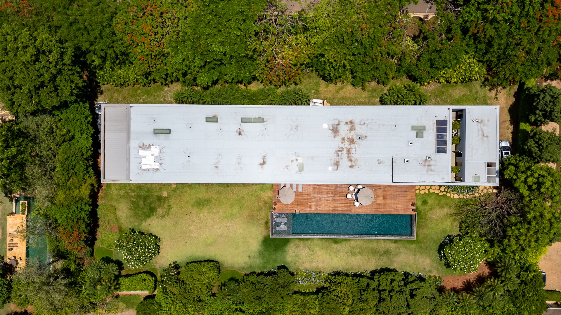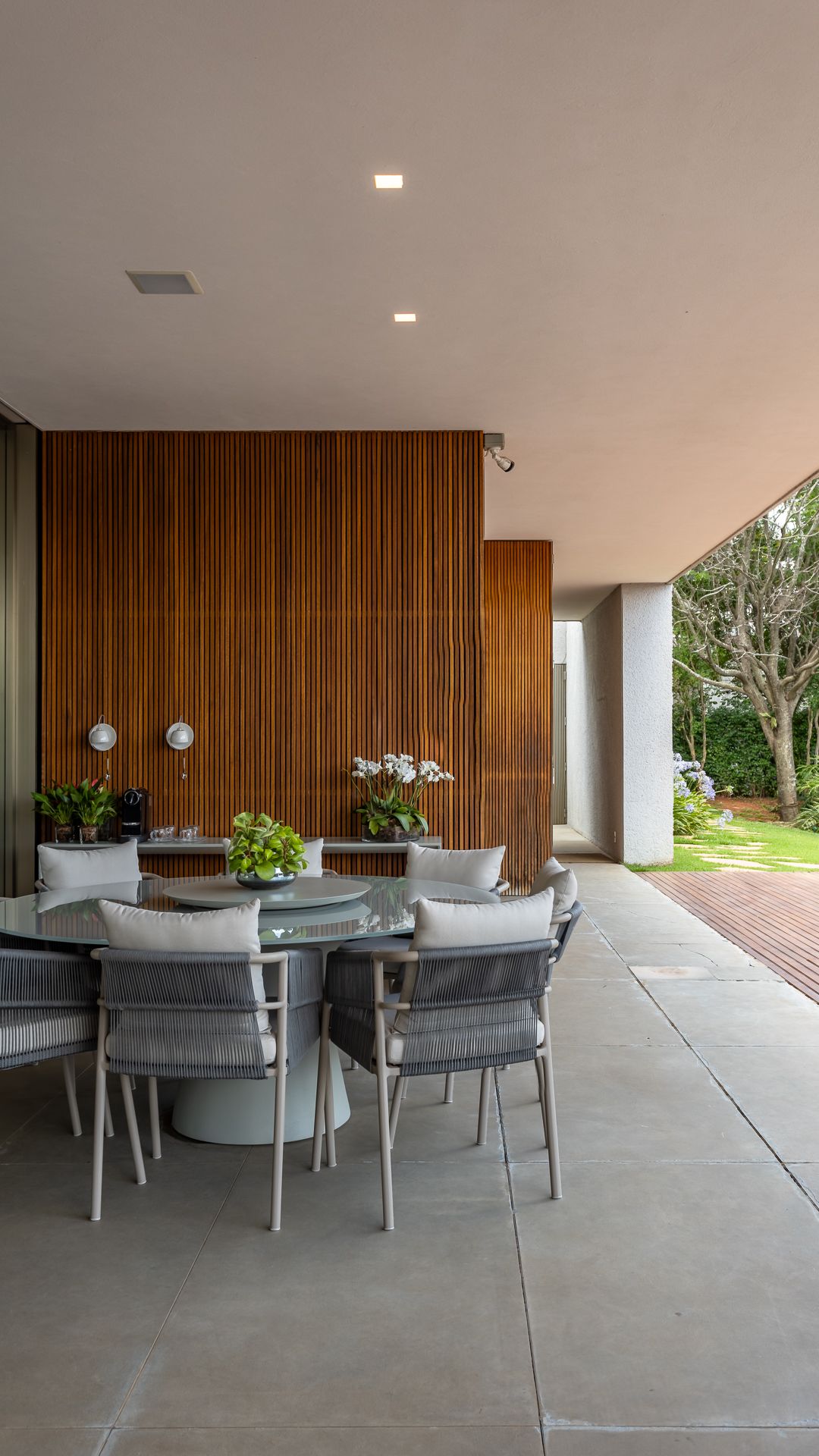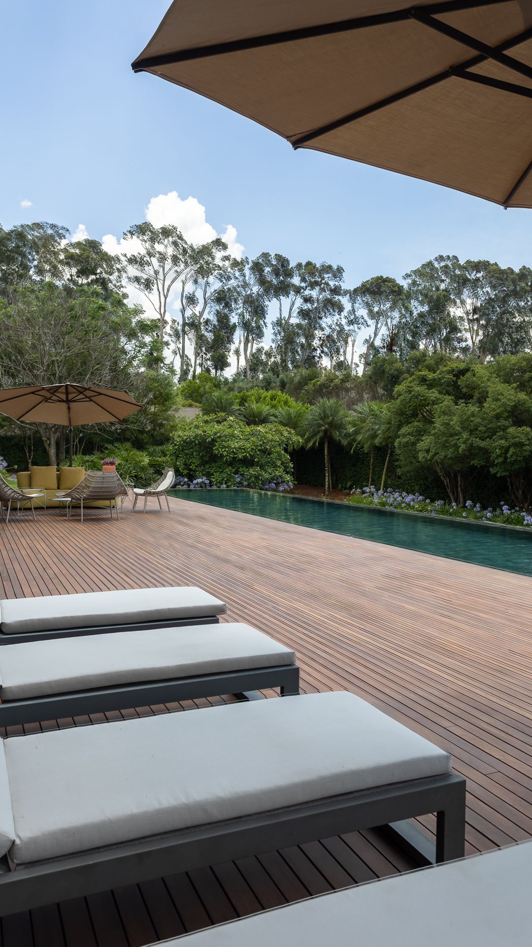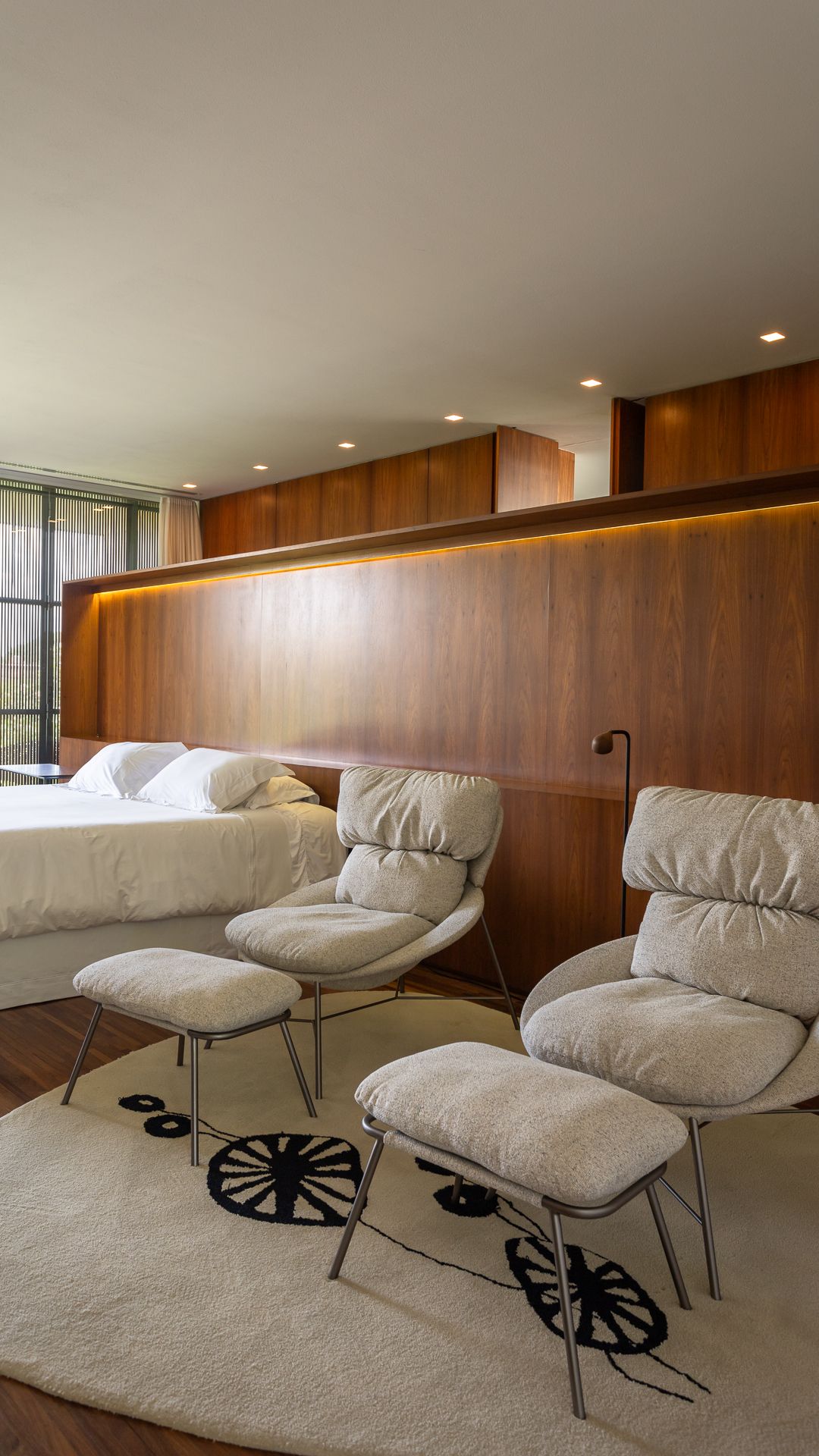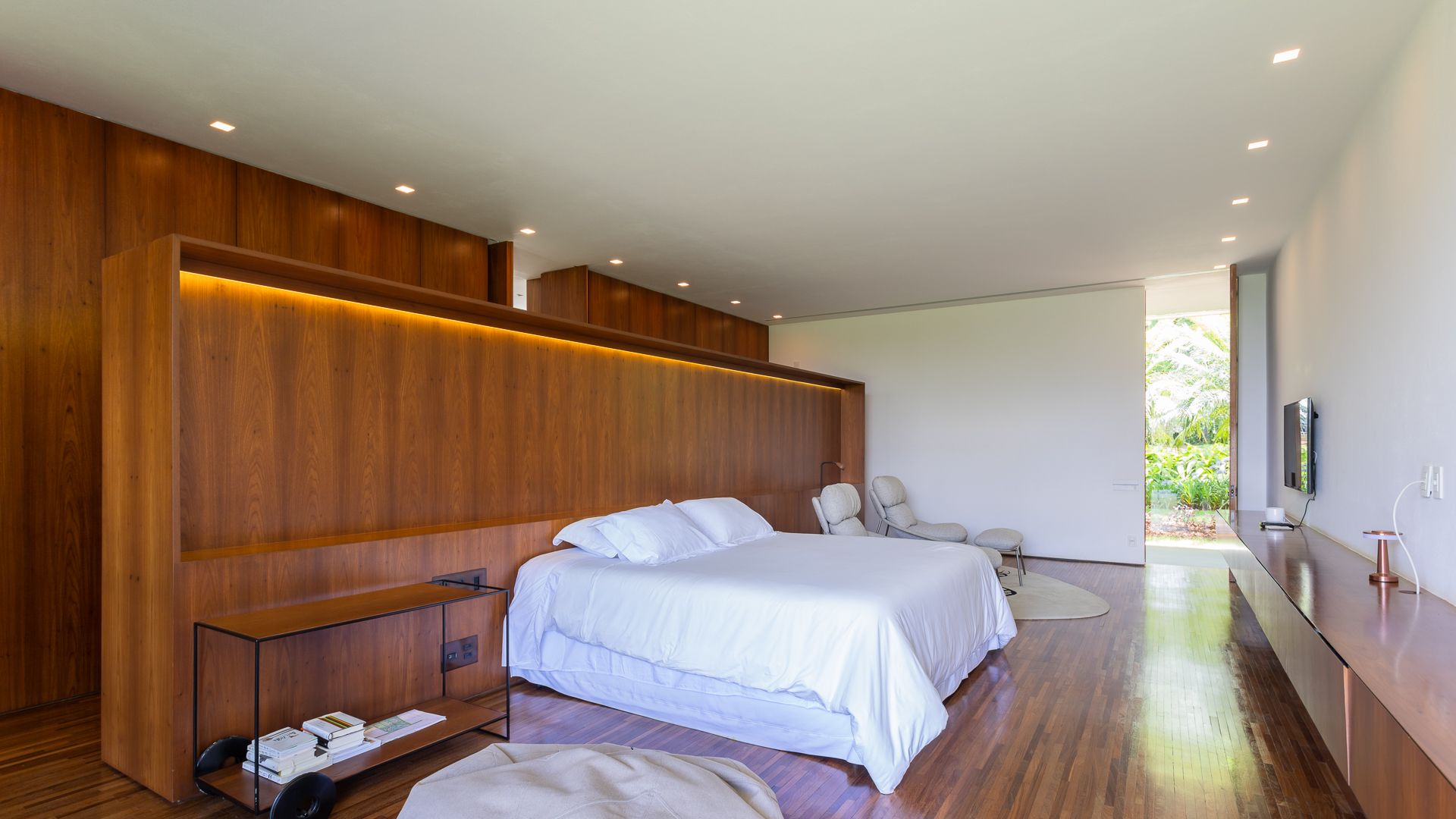 Assinada pelo arquiteto Marcio Kogan, esta residência na Fazenda Boa Vista tem fachada horizontal e programa 100% térreo em lote de 3.950 m². Os ambientes foram pensados em conceito aberto: o living com janelas piso-teto se prolonga ao deck e à piscina, formando um único eixo de convivência; cozinha e bar integram o social para receber com praticidade. A ala íntima traz 4 suítes com acesso também pelo exterior. No final do corredor, um spa com sala de ginástica e sauna completa o lazer privado. Área construída/privativa: 1.010 m² • 4 vagas. Venda: R$ 39.900.000.